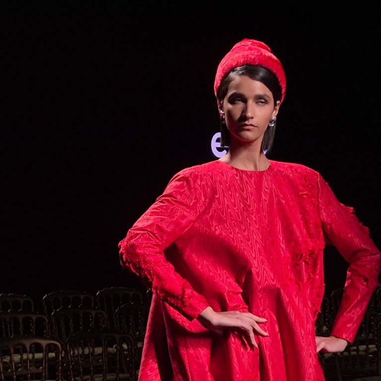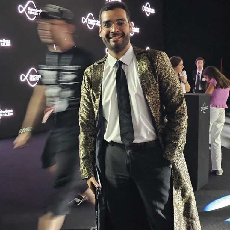 Y el nombre que resonó fue Guillermo Décimo, ganador del premio Mercedes-Benz Fashion Talent. Su colección, “In tempo”, se alzó como una propuesta audaz que conjuga teatralidad, artesanía y sensibilidad estética.