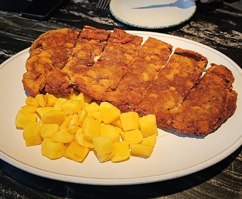 Plato fuerte: el cachopo XL, rico en sabor, bien empanado y con un relleno generoso que funde queso, un jamón sabroso y acompañamientos clásicos de patatas crujientes.